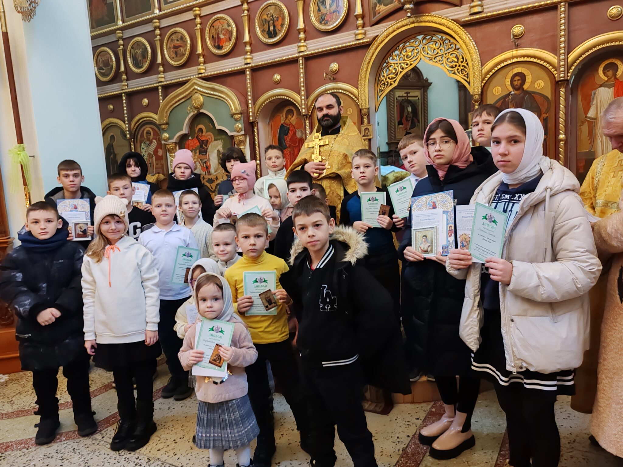 25 декабря 2025 года в храме преподобного Серафима Саровского в г.Белоозёрске после окончания детской службы клирик храма иерей Андрей Русавук поздравил детей с успешным участием в творческих конкурсах, пожелал успехов в деле изучения и познания православной веры и дальнейшего развития творческих дарований, а затем вручил учащимся грамоты и подарки.