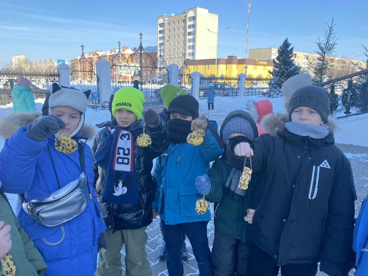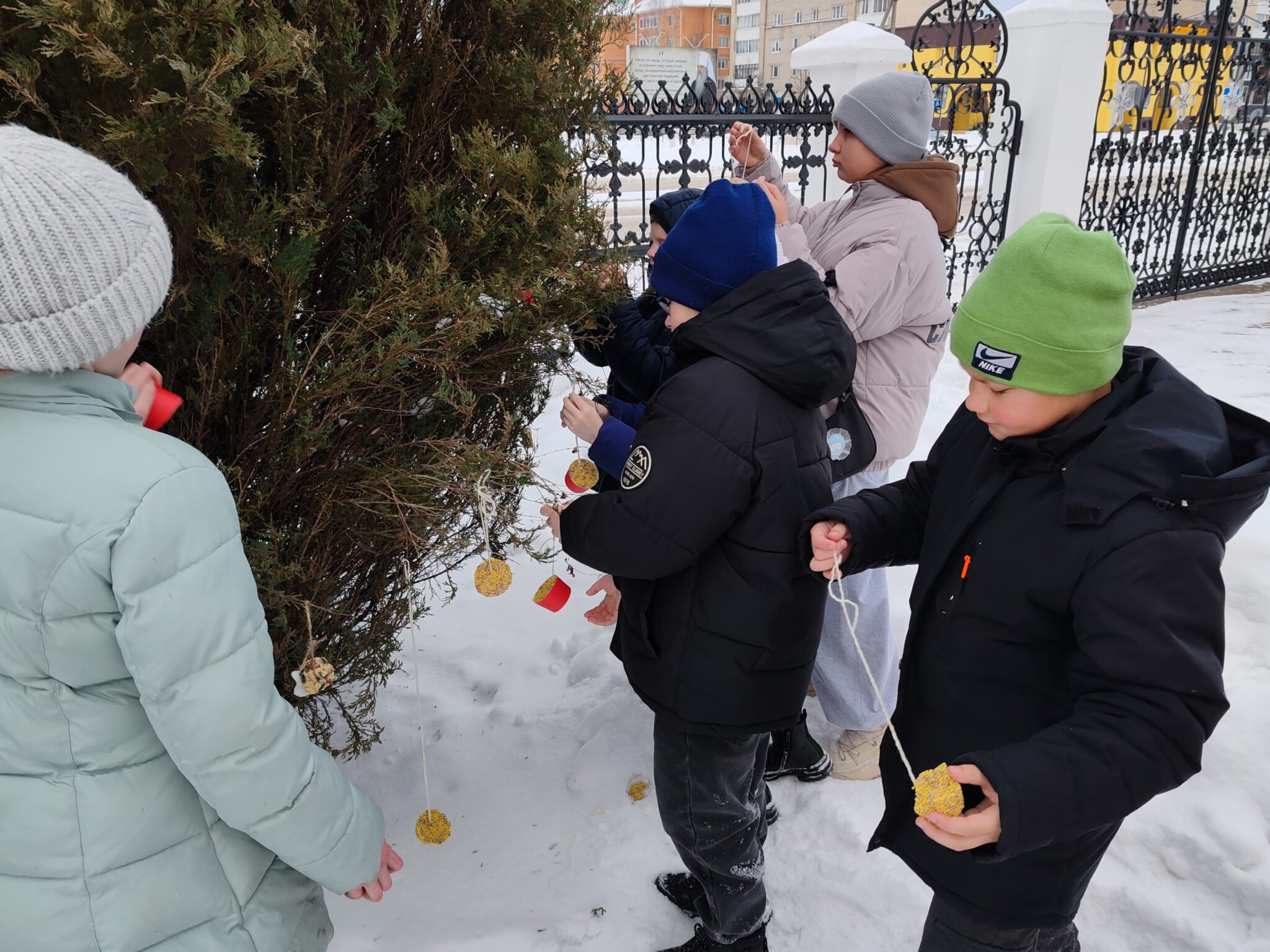 С детьми провели познавательную игру с показом изображений птиц на карточках, а дети должны были назвать зимующих в нашей стране птиц. Дети узнали много интересных фактов о пернатых и смогли угадать все загадки педагогов. Затем дети на натуральной шерстяной нити развесили экологические кормушки на деревьях вокруг храма.