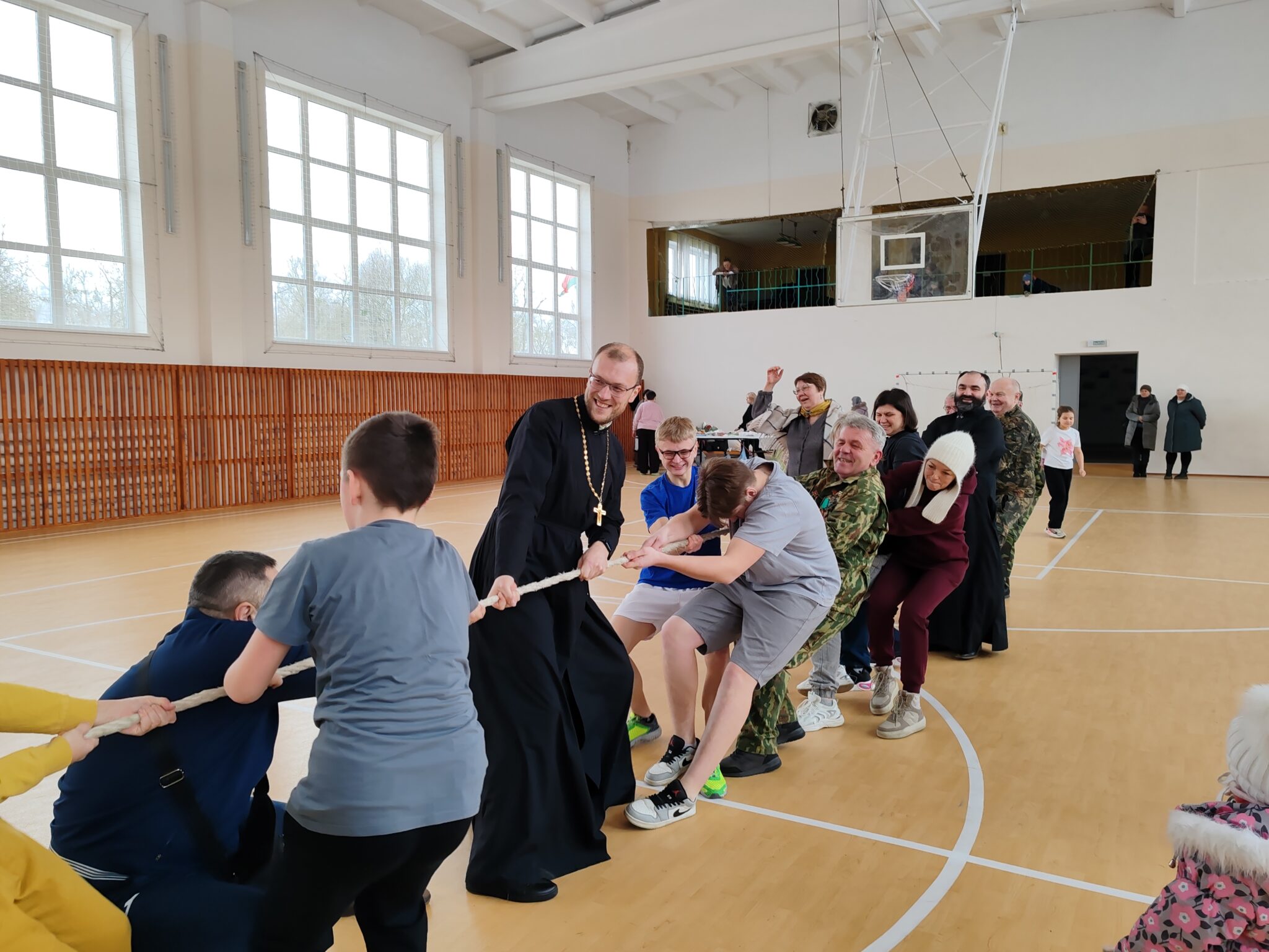 Интересно и увлекательно прошли масленичные состязания. Дети были разделены на три команды, капитанами которых стали выпускники Серафимовской воскресной школы, а ныне участники приходского молодёжного движения в честь великомученика Георгия Победоносца. Руководили конкурсными испытаниями педагоги воскресной школы и  приглашённые гости—воины-интернационалисты. После построения для участников команд начались соревнования. У каждой команды был маршрутный  лист. За успешное прохождение  станции ребята получали стикеры и прикрепляли его на соответствующий сектор круга.