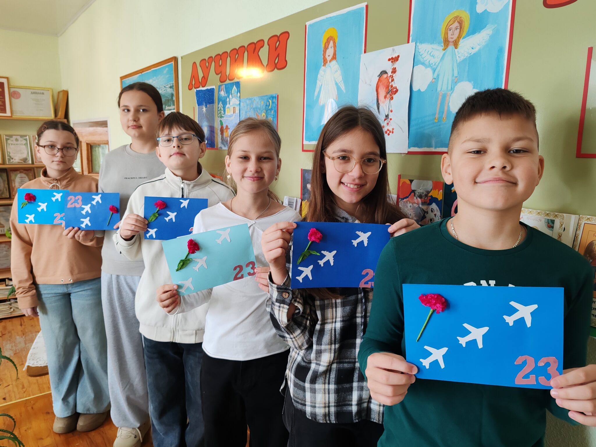 Закончился урок Мужества творческой мастерской, которую провели педагоги Шкробот Мария Михайловна, Борисюк Наталья Александровна, Евкович Ольга Петровна. Педагоги вместе с воспитанниками сделали поздравительные открытки, которые дети вручат в праздничный день старшим мужчинам в семье.