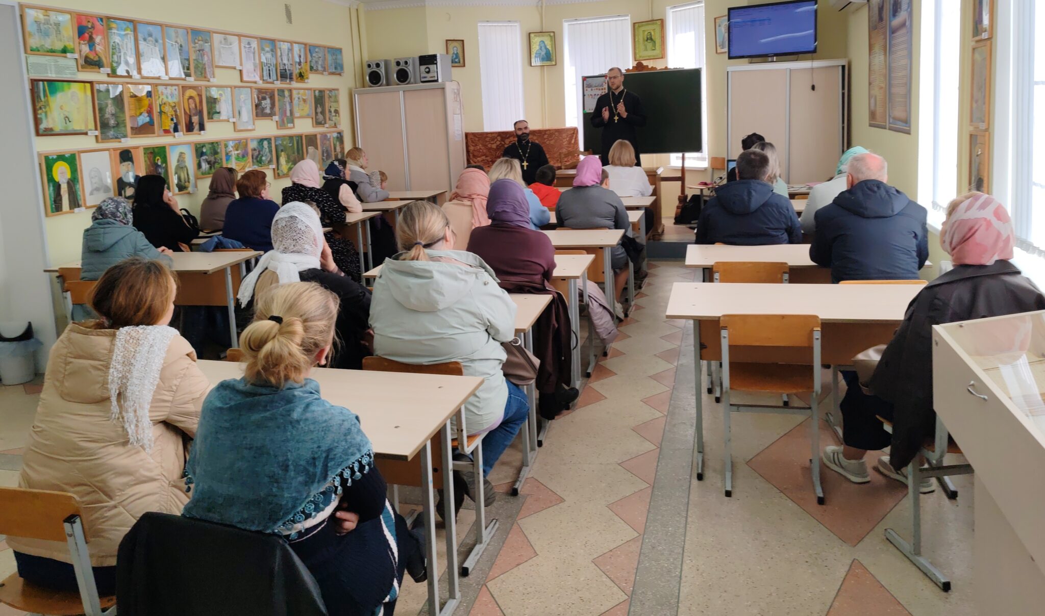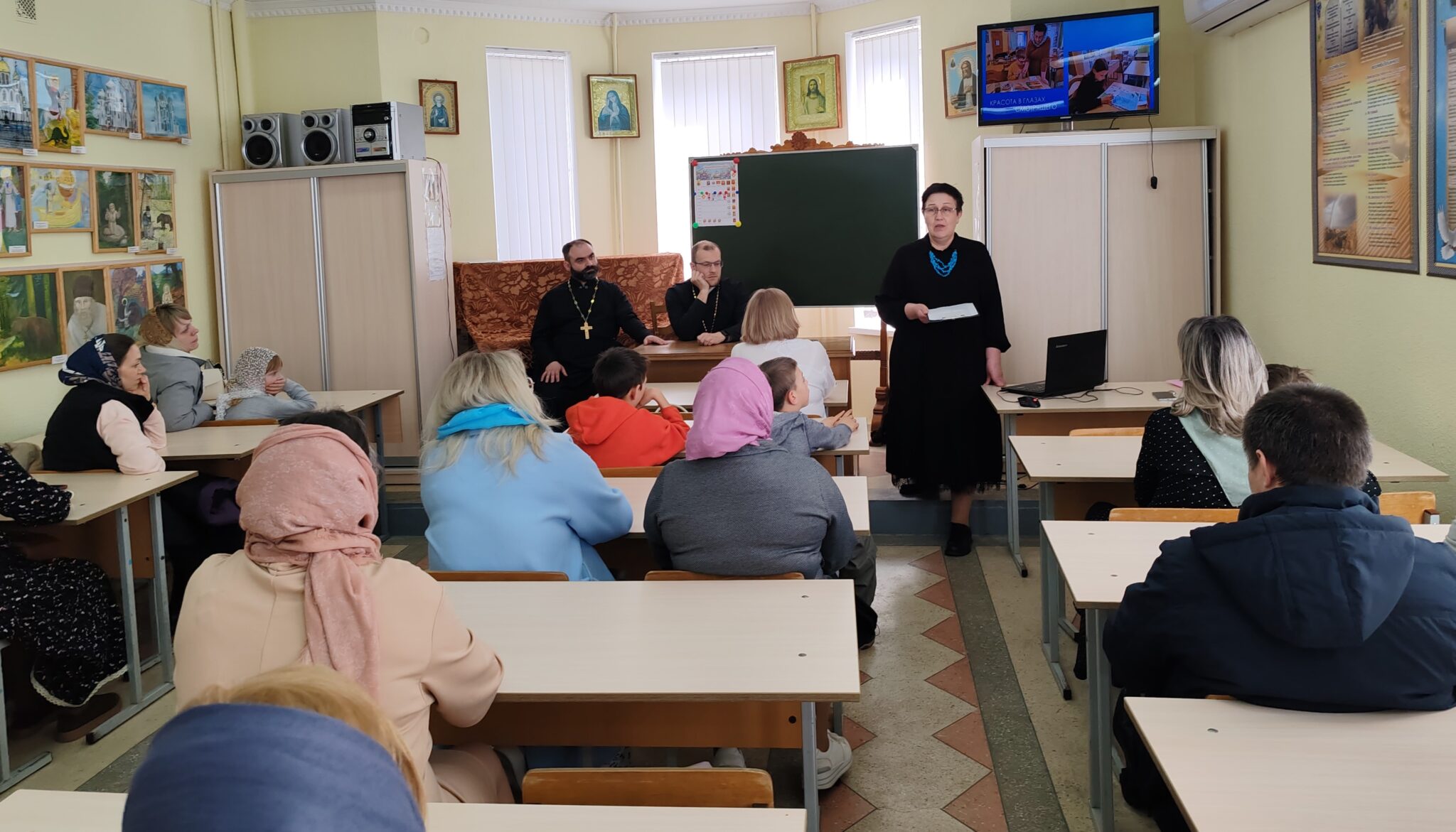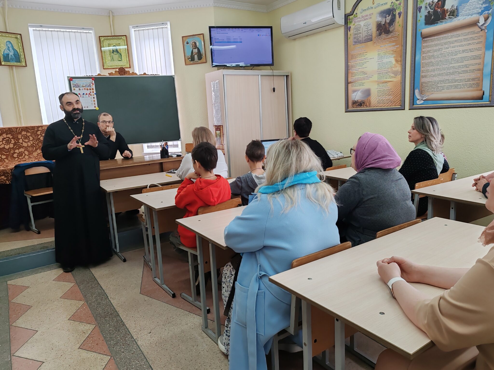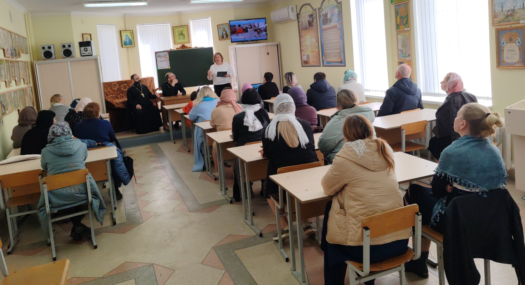 Продолжилось собрание в здании воскресной школы. Веденеева Светлана Сергеевна—заместитель директора по учебно-воспитательной работе Серафимовской воскресной школы, выступила перед родителями с сообщением «Организация детской Литургии на приходе храма преподобного Серафима Саровского в г. Белоозёрске». Педагог рассказала о различных формах учебной и внеучебной деятельности школы, направленных на катехизацию и воцерковление учащихся.